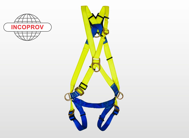 Arnés de cuerpo entero tipo “H” en reata de poliéster con argolla dorsal en “D” para detención o restricción de caídas, argolla pectoral en “D” para realizar conexión segura en actividades de ascenso y descenso; posee dos (2) argollas laterales a nivel pélvico para actividades de poscionamiento.